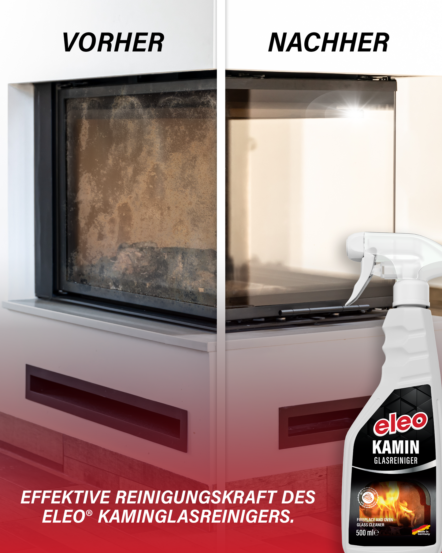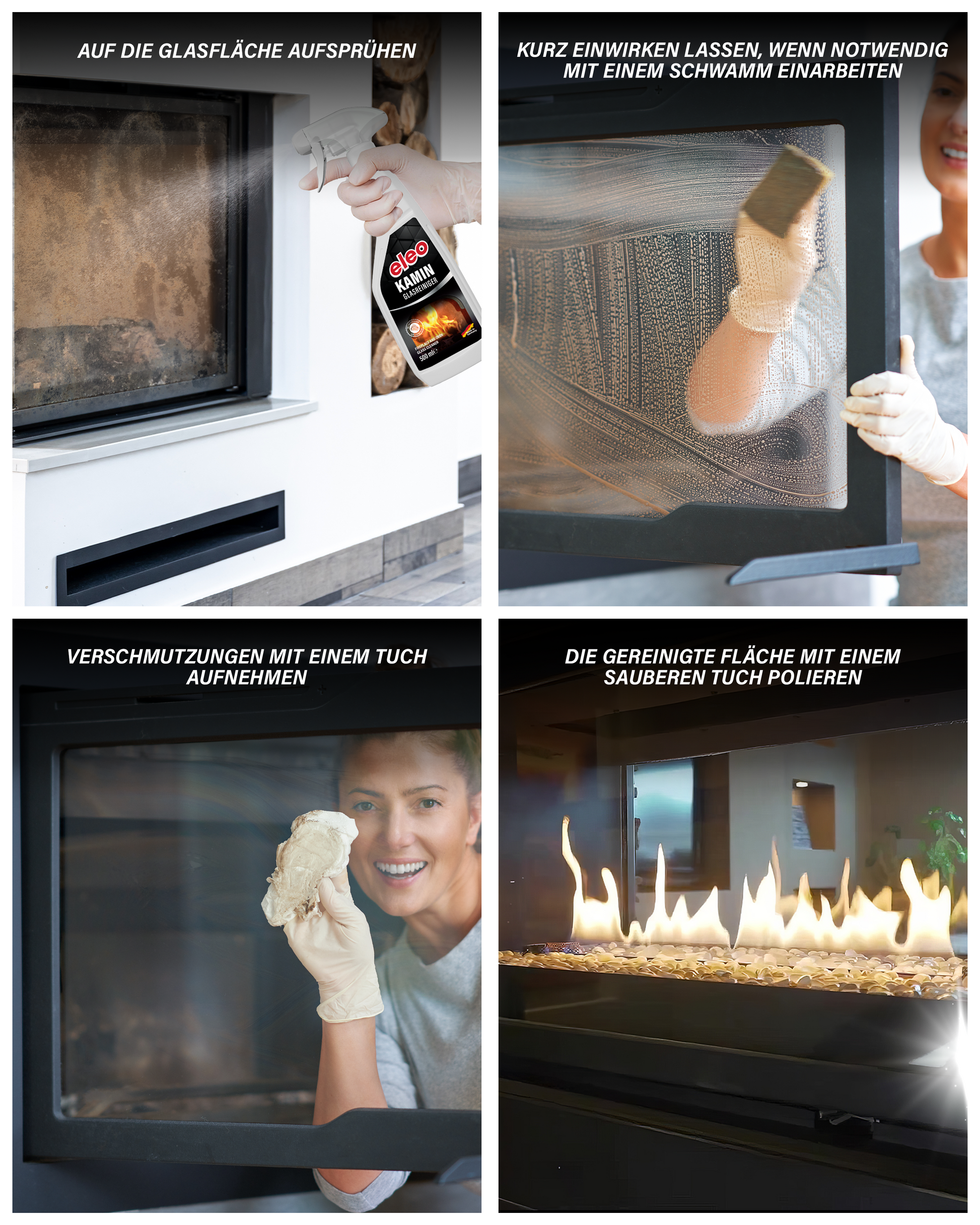 Der eleo® Kaminglasreiniger sorgt in kürzester Zeit für klare Sicht auf Ihr Kaminfeuer. Dank seiner hochwirksamen Formel entfernt er Ruß, Brennrückstände, Teer und Fett gründlich – ganz ohne langes Schrubben. Der spezielle Aktivschaum haftet optimal an senkrechten Flächen, löst Verschmutzungen effektiv an und ermöglicht so eine punktgenaue Anwendung ohne Tropfen. Einfach aufsprühen, einwirken lassen und mit einem Tuch abwischen – für glasklare Kaminscheiben in wenigen Minuten.