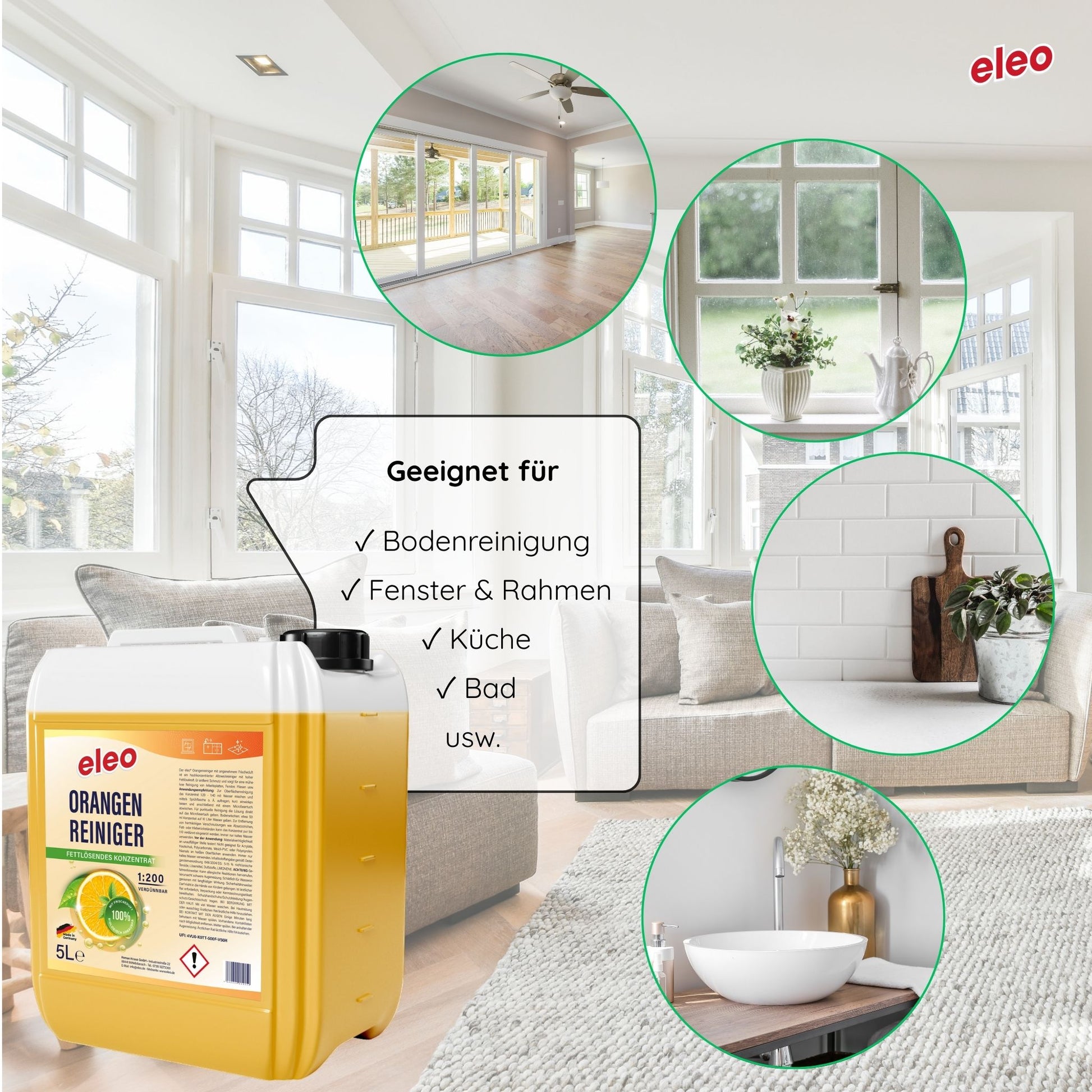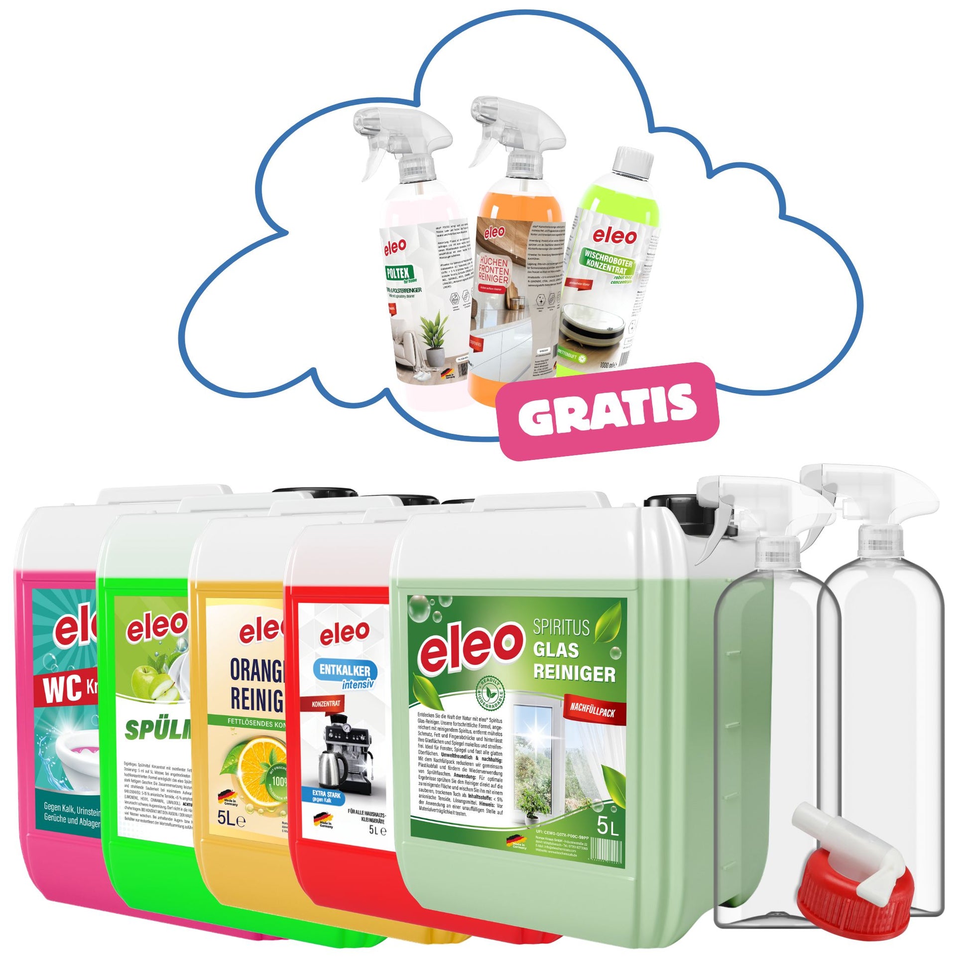 Deutsche Haushalte geben im Schnitt rund 260–300 € pro Jahr für Reinigungsmittel aus; oft in Form vieler kleiner Flaschen, die schnell leer sind und unnötig viel Plastik verursachen. Mit den 5 L-Großgebinden von eleo® sparst du bares Geld, reduzierst Verpackungsmüll und bist für jede Reinigungssituation bestens ausgestattet – ohne ständig an's Nachkaufen denken zu müssen.